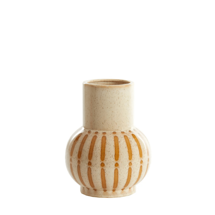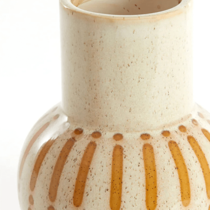 אגרטל בעיצוב עגול ורך, בגוון שמנת טבעי ובדוגמת קווים ידנית בגוון אדמה חמה.