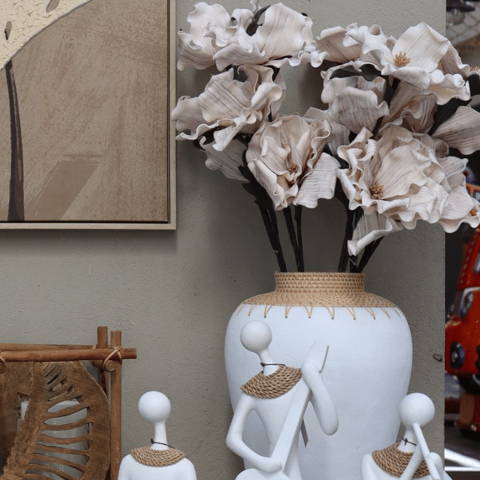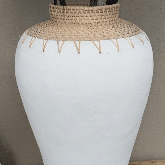 אגרטל מעוצב בגוון לבן נקי, בשילוב עיטור קלוע טבעי בחלקו העליון,
