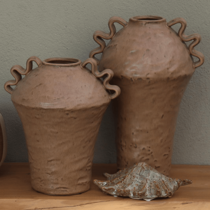 במראה מחוספס ועמוק, עם עבודה ידנית של ידיות גליות המקיפות את החלק העליון ומעניקות תחושת תנועה אורגנית.