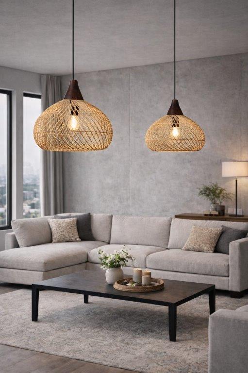 מנורת תלייה עשויה ראטן טבעי קלוע, בשילוב חלק עליון מעץ אגוז אמריקאי איכותי, המעניק לה מראה חמים, טבעי ואלגנטי.