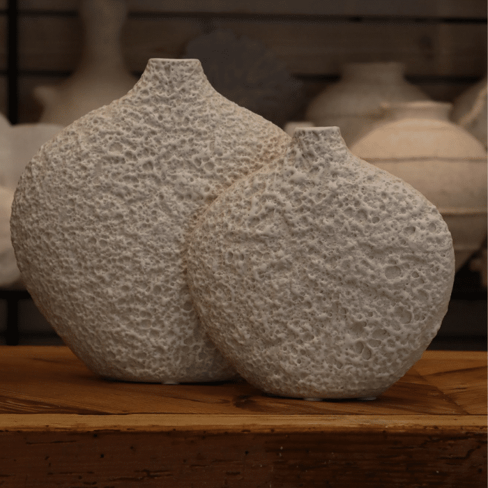 כדים בגוון לבן טבעי, עם מרקם סלעי שמעניק עומק ועניין עיצובי.