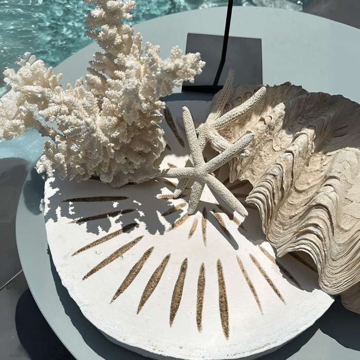 מגש דקורטיבי בעבודת יד ייחודית עם חיתוכי קרניים עדינים היוצרים מראה טבעי ובעל נוכחות.