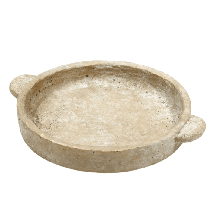 מגש עגול דקורטיבי עם ידיות צד, עשוי דמוי טרוורטין בגוון אבן טבעי.