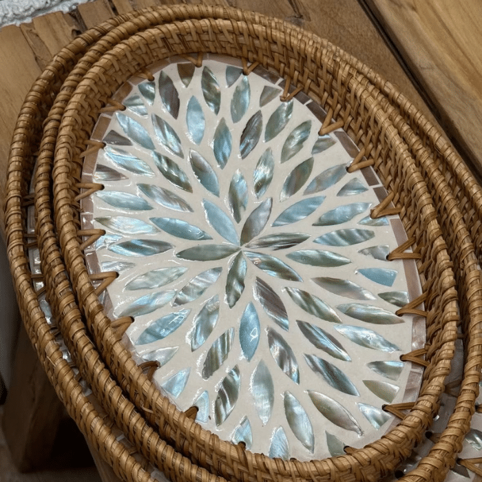 מגשים עגולים קלועים בשילוב דוגמת עלים עדינה מפנינת צדף.