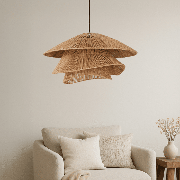 מנורת תקרה עשויה יוטה, בעיצוב תלת־שכבתי שמעניק מראה עשיר ודינמי לחלל.