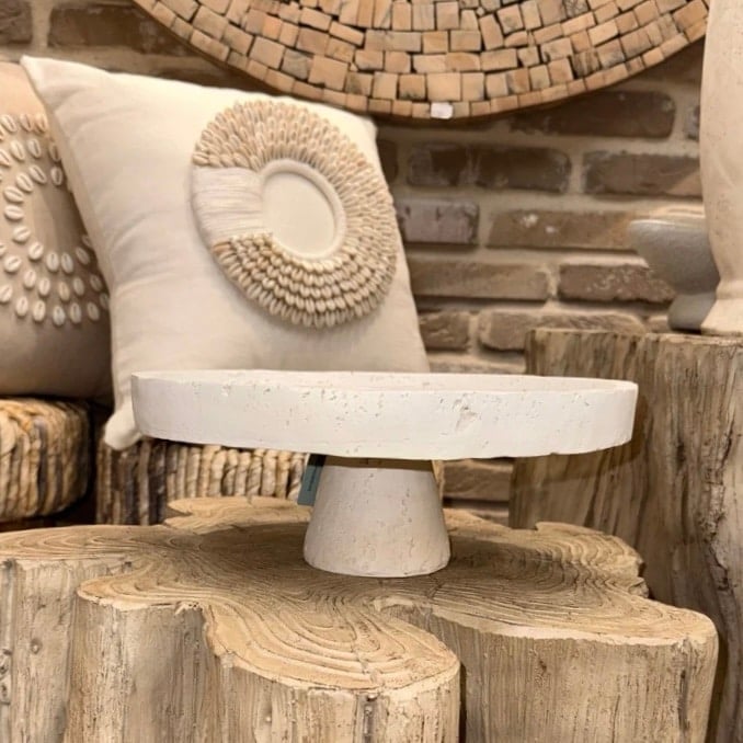 מגש עגול בעיצוב נקי ומאוזן, עשוי חומר דמוי טרוונטין במראה אבן טבעית.