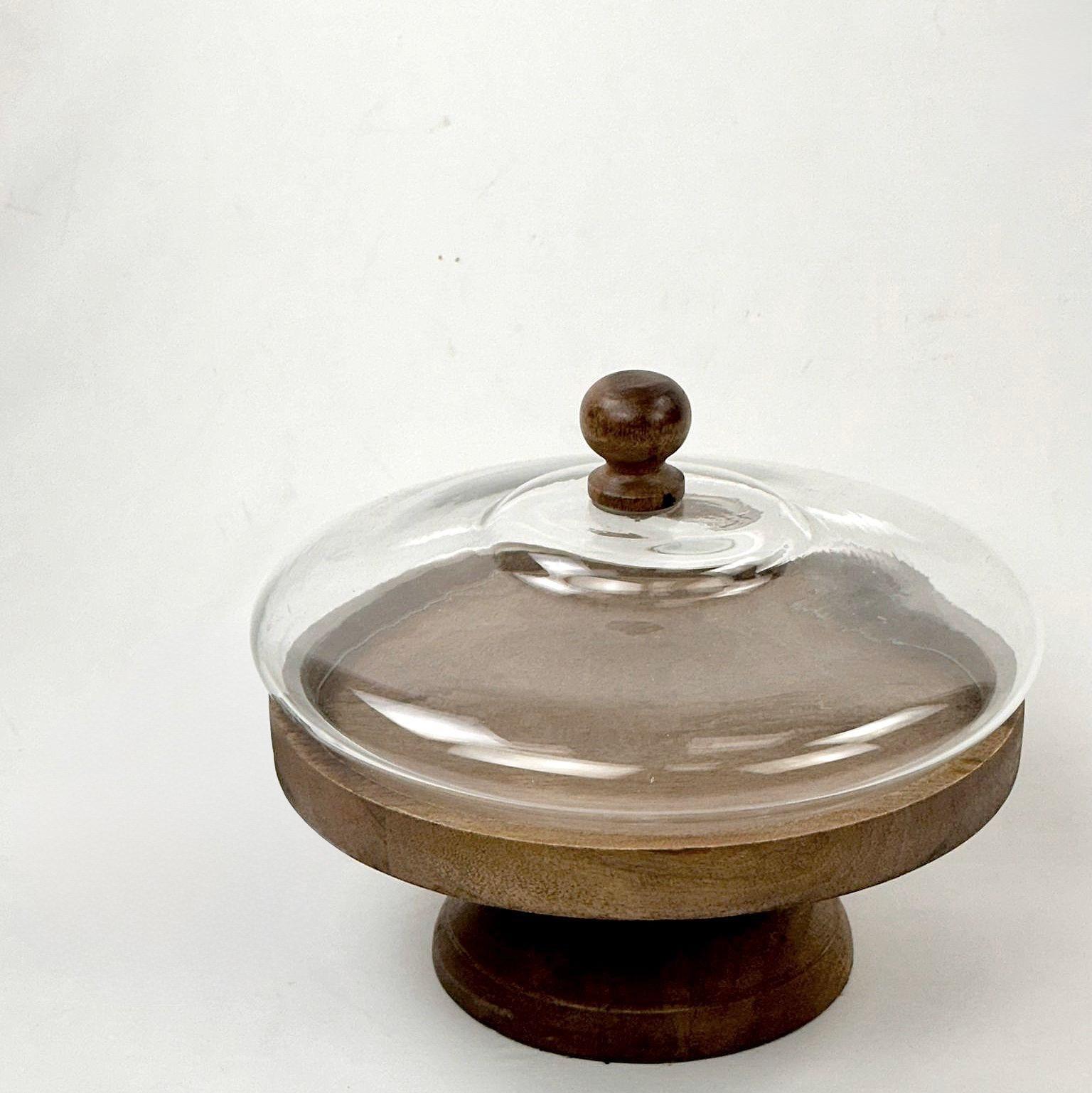 סטנד הגשה אלגנטי עשוי עץ טבעי בשילוב כיפת זכוכית שקופה, המעניק מראה חם, נקי ומעוצב לכל שולחן אירוח. מתאים להגשת עוגות, מאפים, עוגיות ופירות תוך שמירה על טריות והגנה מפני אבק.