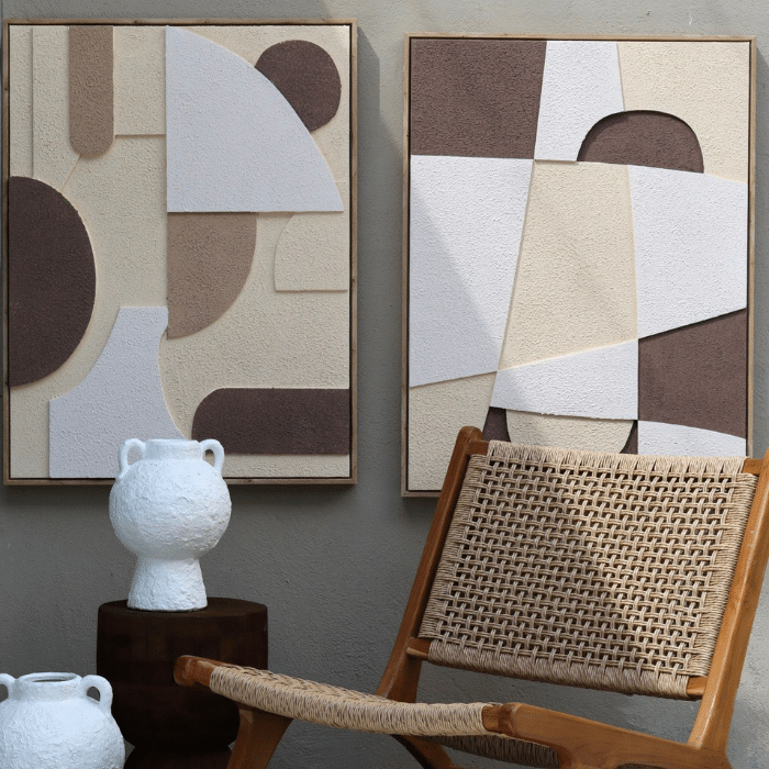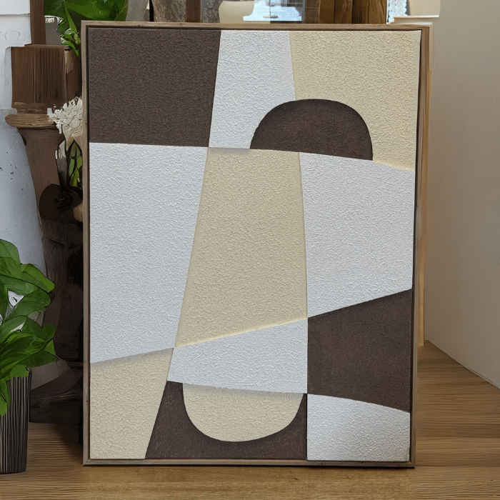 תמונה מודרנית בגווני ניטרליים, המשלבת טקסטורות עשירות וצורות משתלבות בקווים אלגנטיים.