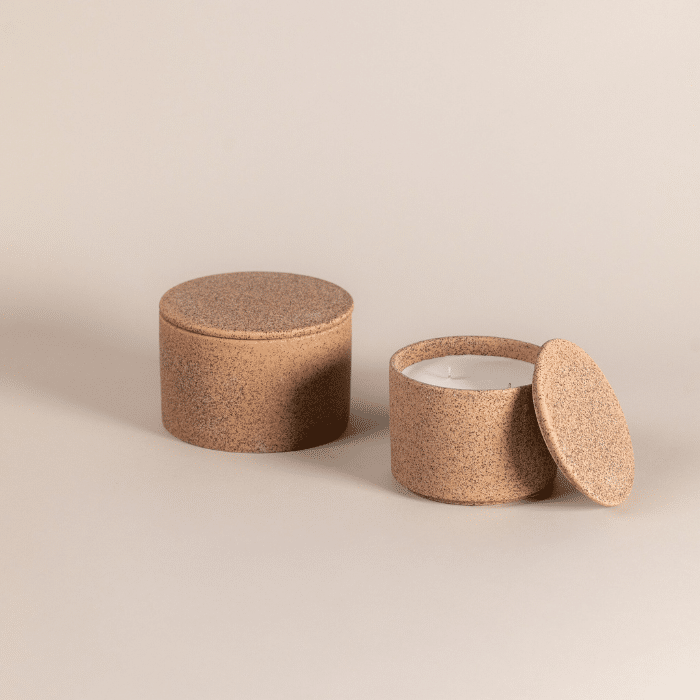 נר בעיצוב מינימליסטי ומדויק, יצוק בתוך כלי עגול עם מכסה תואם המוסיף מראה נקי ואסתטי.