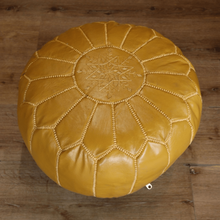 פוף עגול מעור אותנטי בגוון צהוב, בעבודת יד מסורתית ובגימור מדויק.