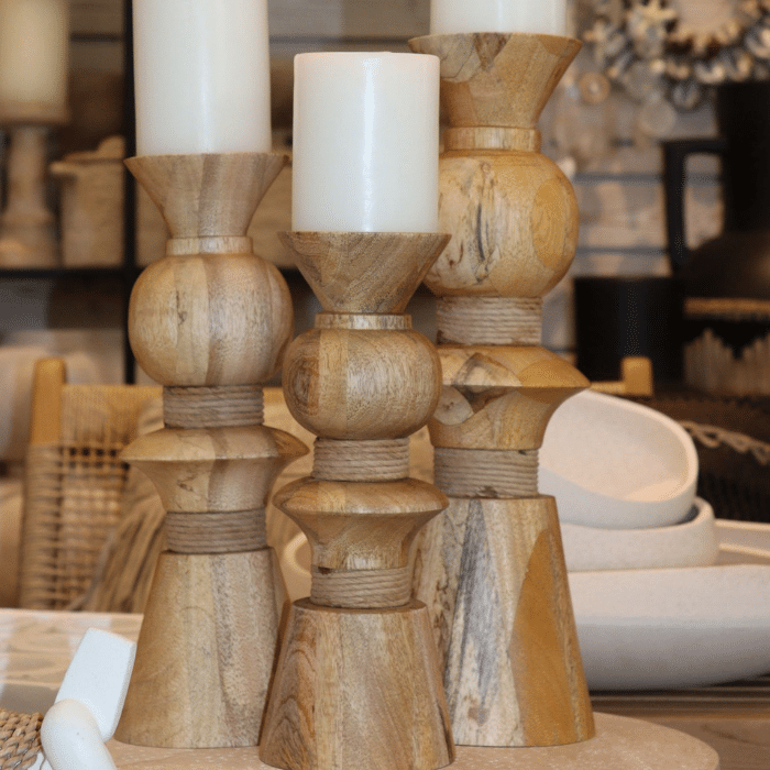 פמוטים בעבודת יד מעץ מנגו טבעי, עם עיצוב גיאומטרי משולב קווים רכים.