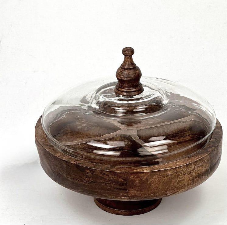 פעמון זכוכית שקוף עם מכסה וידית עץ מעוצבת, מונח על בסיס עץ מלא בגוון חום טבעי. מושלם להצגת עוגיות, מאפים, גבינות או פריטי דקור מיוחדים. השילוב בין הזכוכית הנקייה לעץ החמים יוצר מראה טבעי, אלגנטי ומזמין שמתאים למטבח, לשולחן אירוח או למדף דקורטיבי.