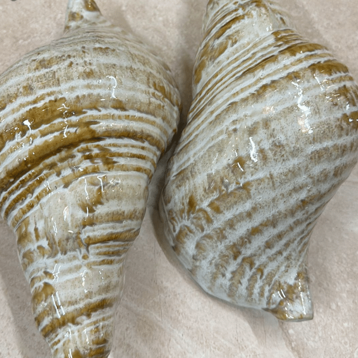 פריט דקורטיבי בצורת קונכייה טבעית, בגוון חול בהיר עם נגיעות אדמה רכות,