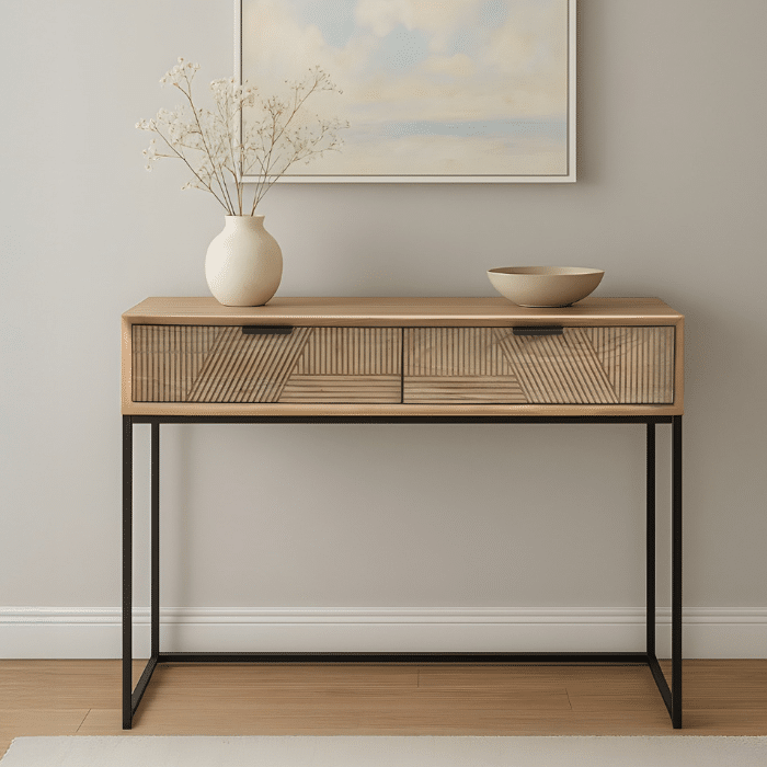 קונסולה מעץ בגוון טבעי עם חזית ייחודית עם שתי מגירות.