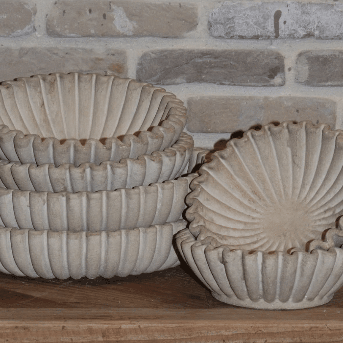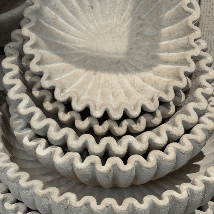 קערות מעוצבות מבטון, בעלות טקסטורה מחורצת שמוסיפה עומק ונוכחות.