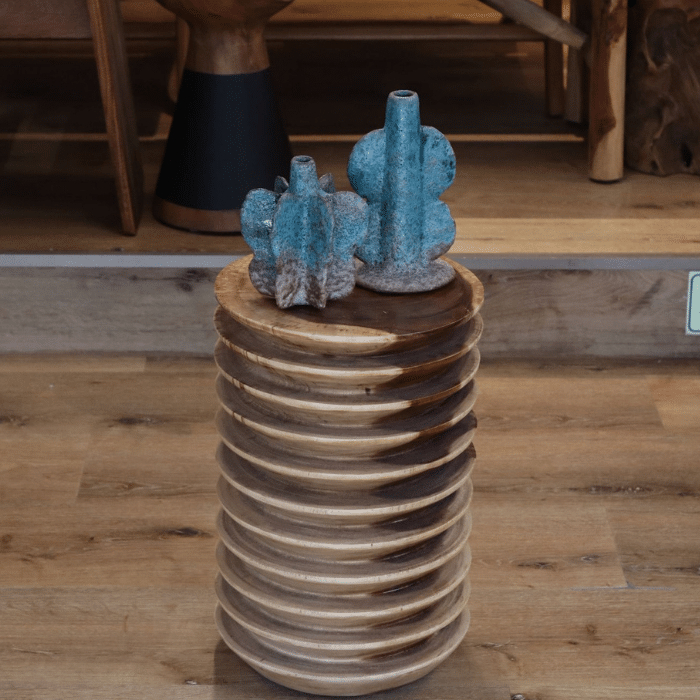 מבנהו הגלילי מעניק נוכחות רכה אך מרשימה בחלל, והוא מתאים כשולחן צד או כשידת נוי.
