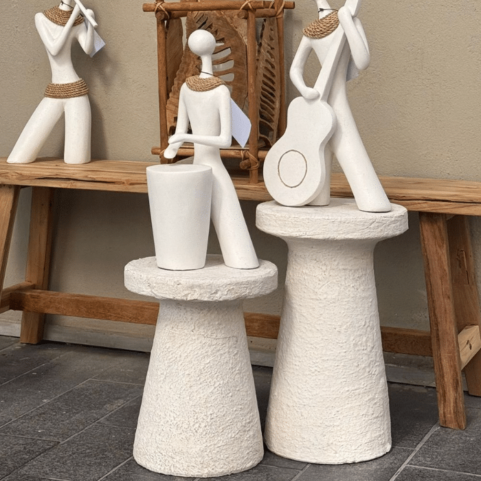 שולחן צד מעוצב בקו טבעי ומינימליסטי, עשוי מחומר דמוי אבן בגוון בהיר.