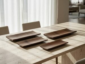 עשויה מצורות עץ טבעי המעוצבות בקפידה ומונחות על רקע טקסטורה עדינה בגוון לבן או חום חמים, במסגרת עץ טבעי.