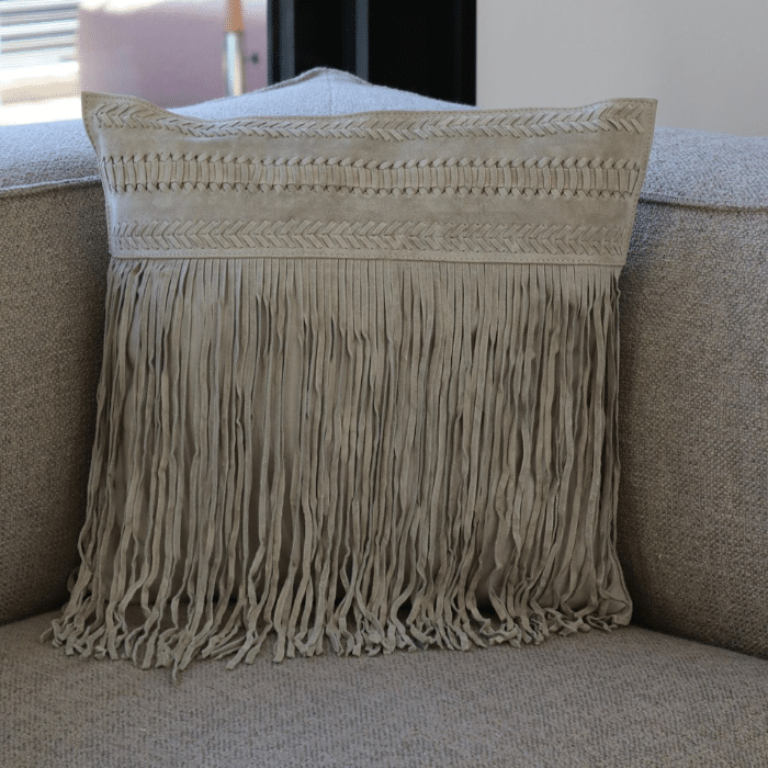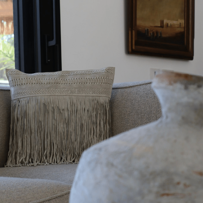 כרית דקורטיבית משולבת עור בסגנון בוהו־שיק בגוון טבעי.