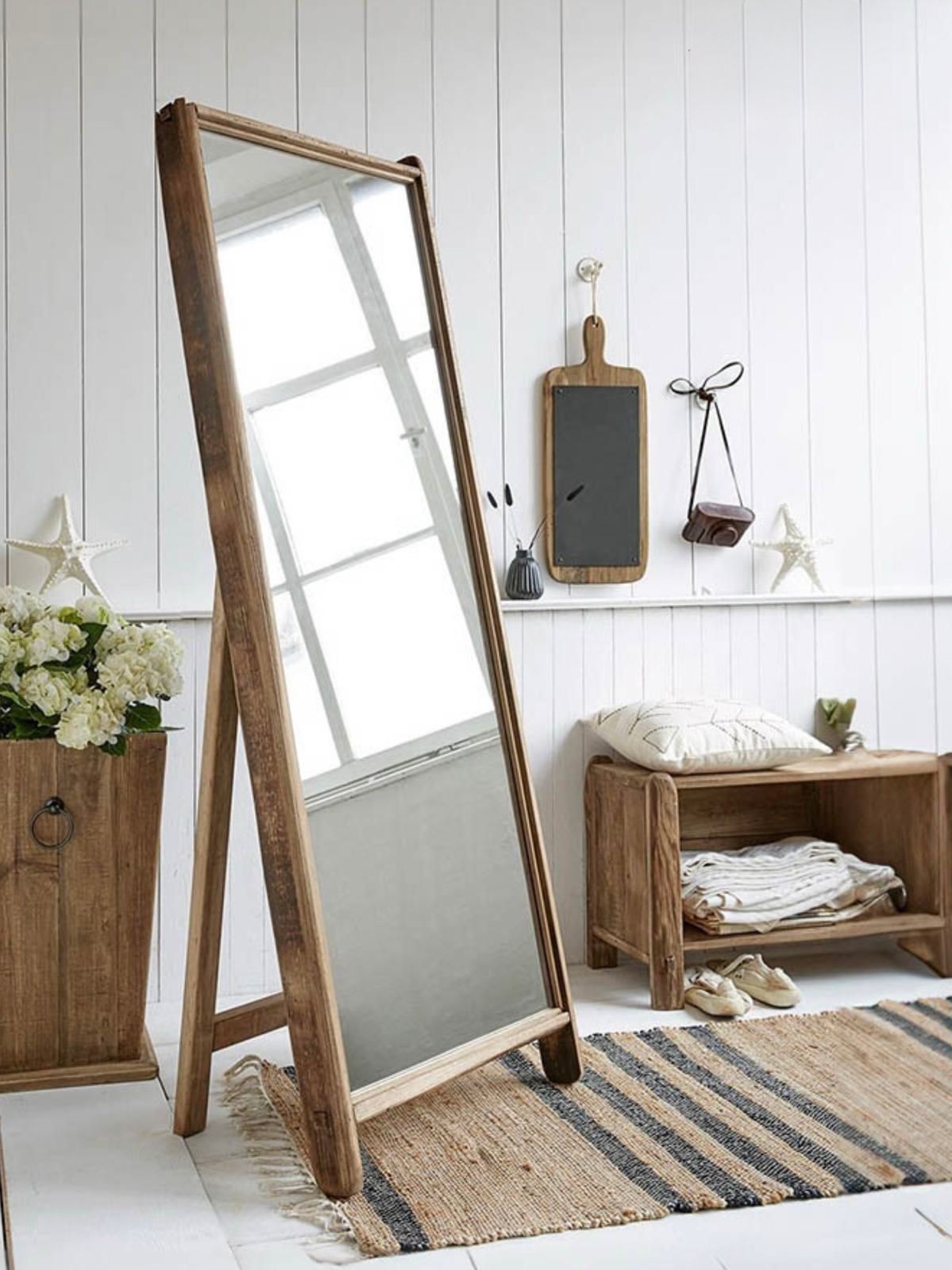 מראת גוף עומדת במסגרת עץ טבעי בעיצוב נקי וחם.