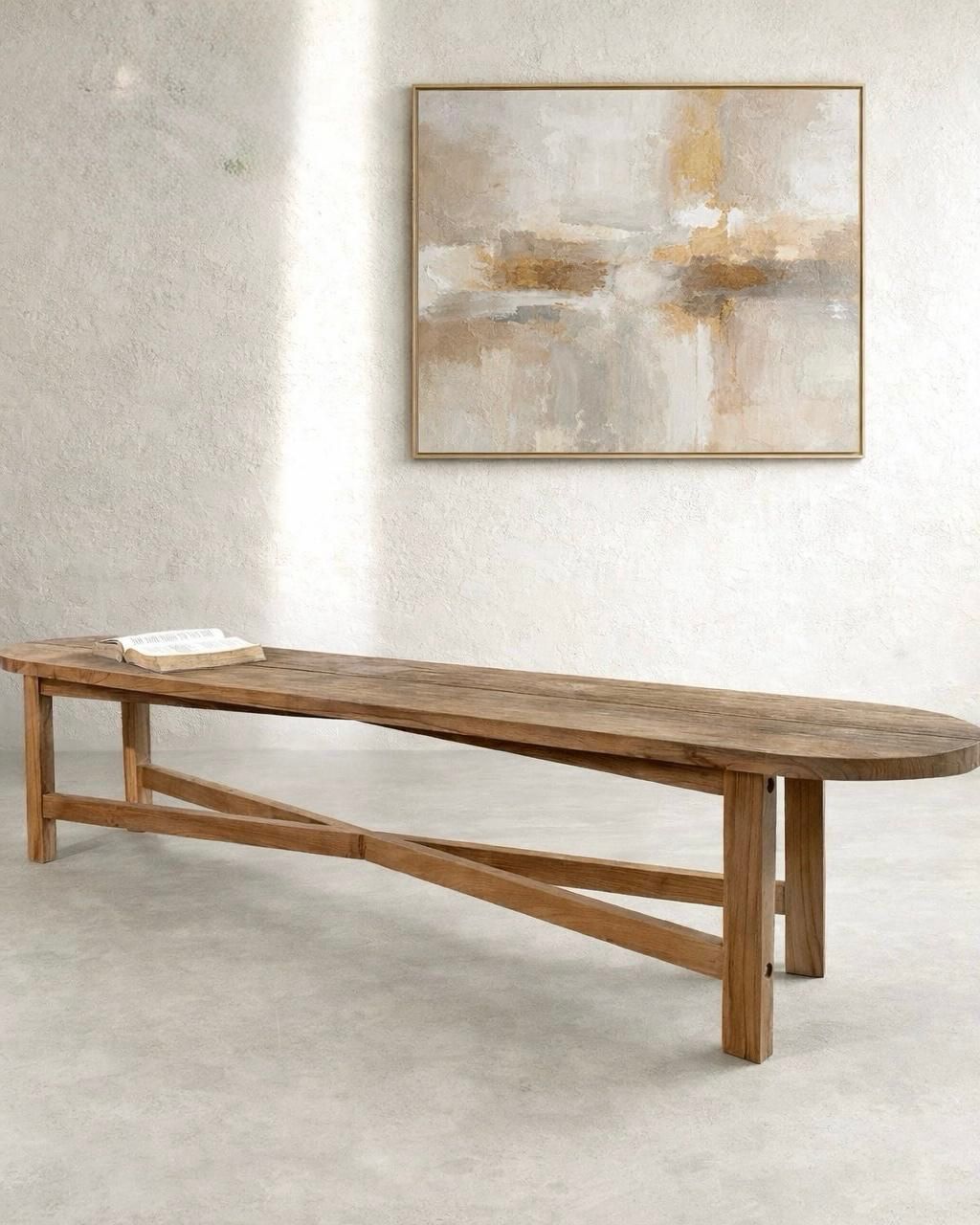 ספסל ארוך ומרשים עשוי עץ טיק טבעי בגימור חמים וטבעי. העיצוב הנקי והאלגנטי מדגיש את היופי של העץ ומעניק לחלל תחושת טבע ורוגע.עץ הטיק ידוע בעמידות הגבוהה שלו ובמראה העשיר שלו, מה שהופך את הספסל לפריט עיצובי ופונקציונלי כאחד. מתאים לשימוש בכניסה לבית, לצד שולחן אוכל, בחדר שינה או כפריט דקורטיבי בסלון.