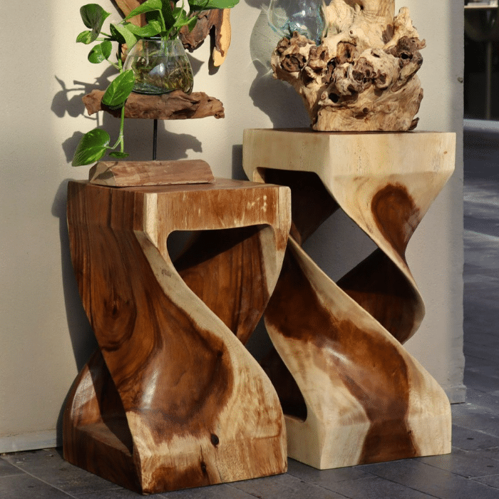 שולחן צד ייחודי ומלא אופי, עשוי עץ סוואר ומגולף בתנועה ספירלית