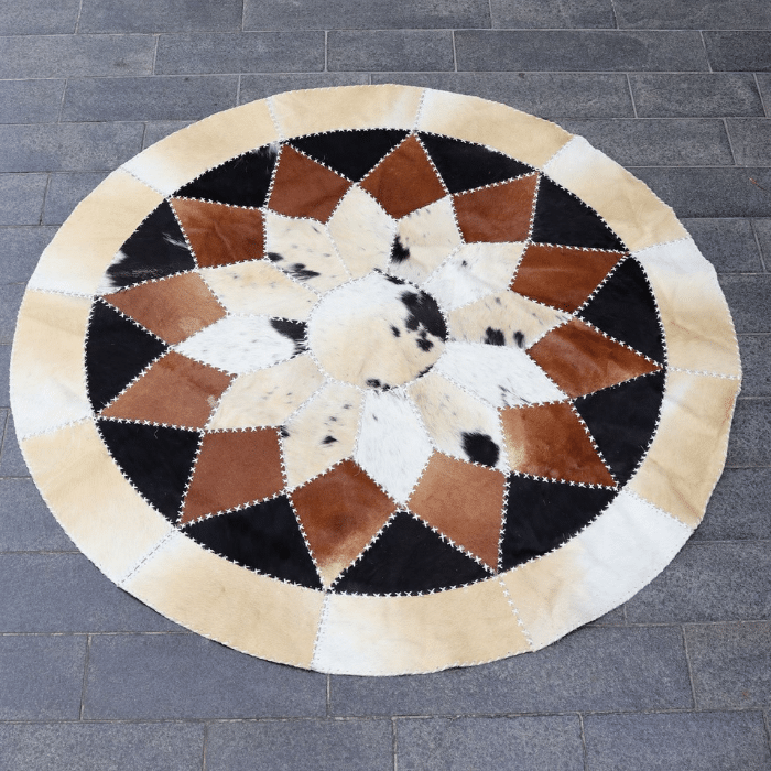 שטיח ייחודי בעבודת יד, עשוי עור טבעי בתפירת טלאים מוקפדת ואיכותית.
